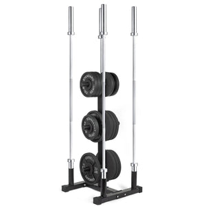 Declutter your home gym with this heavy-duty 3-tier Olympic weight rack, built from powder-coated steel and supporting up to 400 kg. Features include plate storage, integrated bar holder, and a compact footprint ideal for tight training spaces.