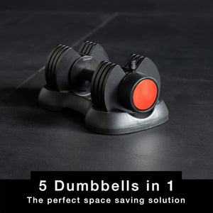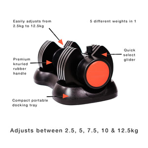 Take your training to the next level with this pair of adjustable 12.5 kg dumbbells, a premium solution for strength training in compact home environments. Designed with five-in-one adjustability, each dumbbell allows you to switch between 2.5 kg to 12.5 kg quickly using an intuitive dial lock system—ideal for progressive overload without cluttering your space.
