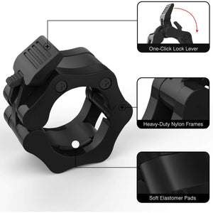 Heavy-duty Olympic barbell collars made from reinforced nylon with a quick-release lever and rubber lining for a tight grip on 2-inch bars. Ideal for safe, fast-paced workouts in your home gym, garage gym, or CrossFit space—with a sleek, compact design.