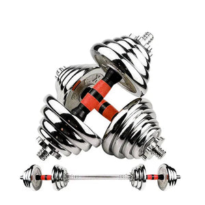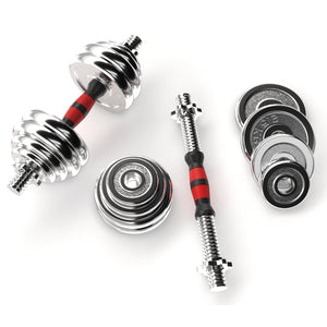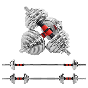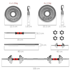 Transform your workout space with this 20 kg adjustable dumbbell and barbell set, engineered for performance, durability, and style. Whether you're building a dedicated setup or upgrading a small corner of your living room, this compact home gym essential delivers serious training potential in a space-saving design. With 4 × 2.5 kg and 4 × 1.25 kg solid cast iron plates, plus two chrome-finished steel rods and a 1.35 kg barbell connector, you’ll have everything needed for a versatile strength routine. Switch between dumbbells and barbell in seconds—perfect for circuit-style training, supersets, or full-body workouts.